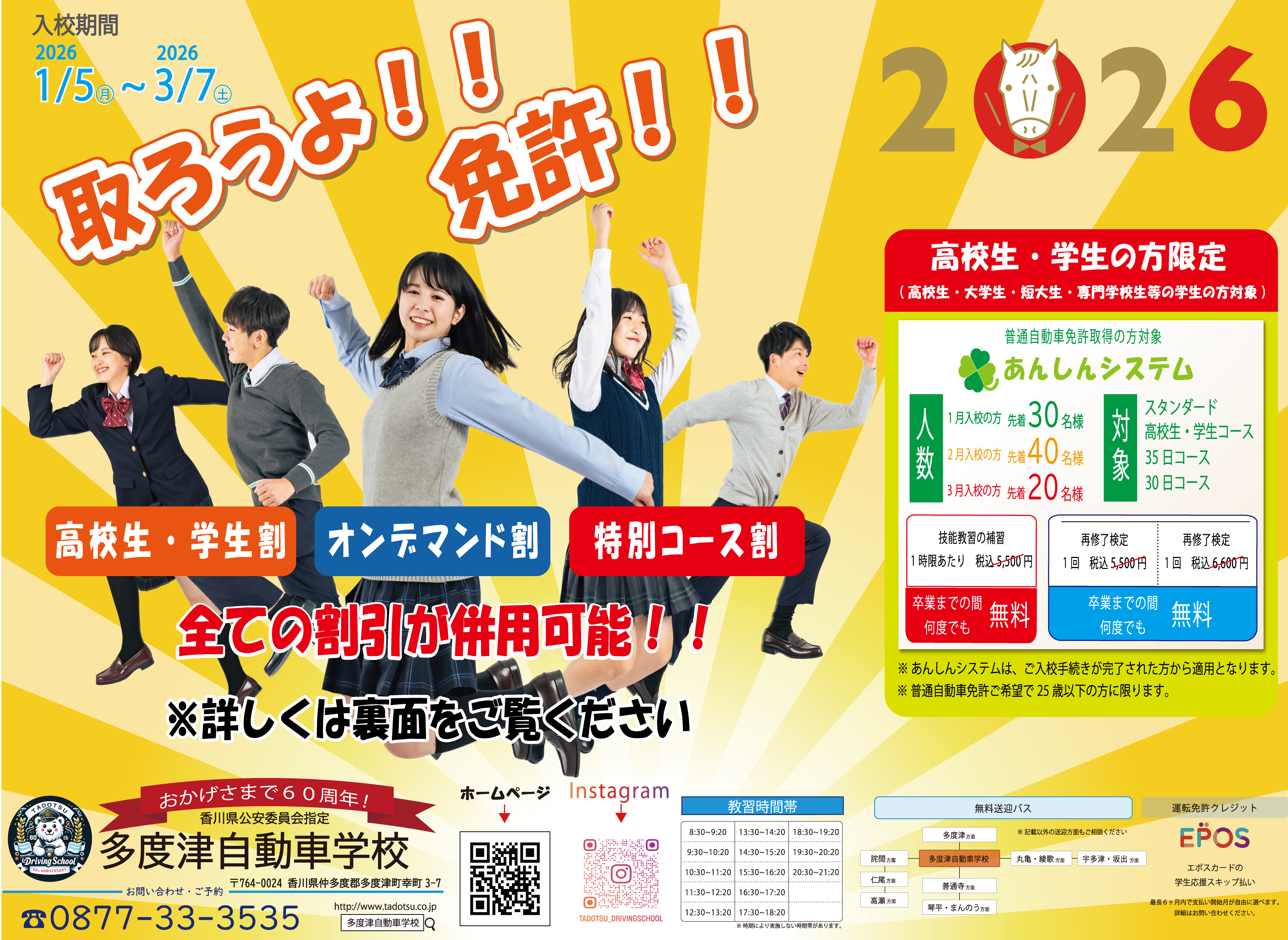 2026年も免許は多度津で!!1月・2月・3月も取ろうよ!!免許!!高校生・学生割(学生の方なら誰でも可)とオンデマンド割、さらに指定コース割で教習料金が最大16,500円割引!!補習・再検定が何度でも無料になるあんしんシステムは先着順です。学生の方、ご予約はお早めに!!