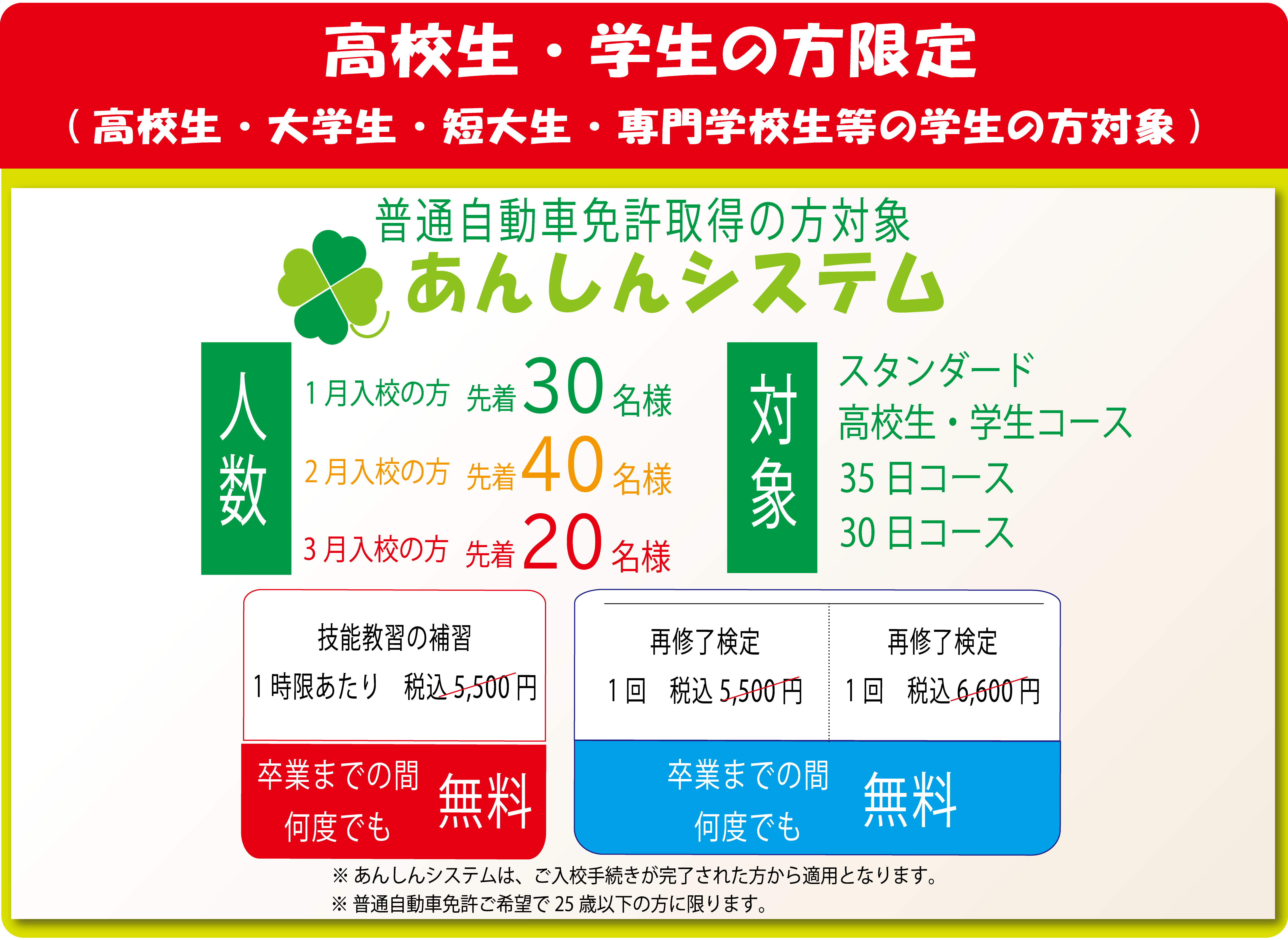 高校生・学生コース、35日コース、30日コース限定!!1月入校の方先着30名様、2月入校の方先着40名様、3月入校の方先着20名様に技能補習料金・技能再検定料金が何度でも無料になるあんしんシステムがついてきます!!