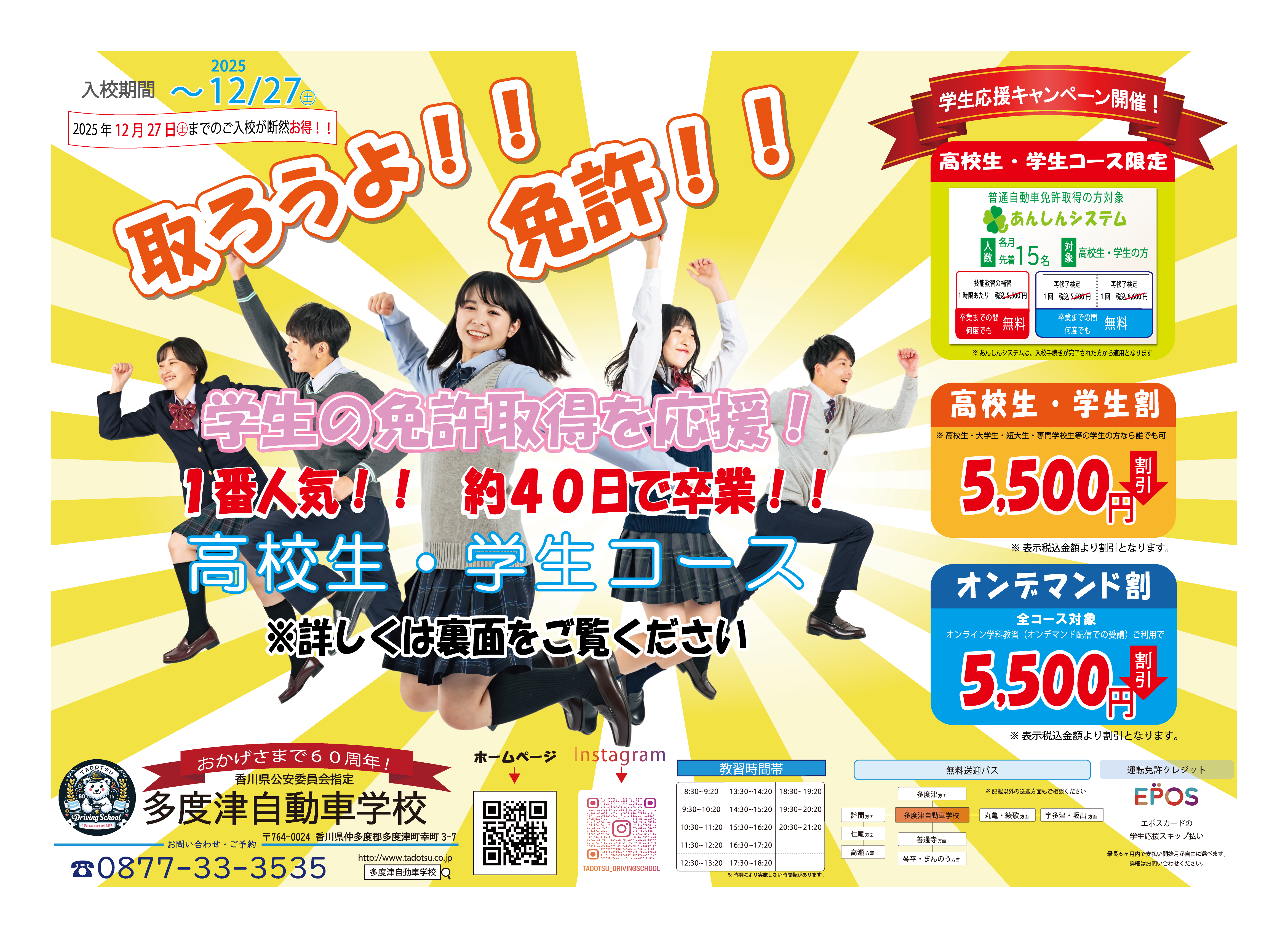 取ろうよ!!免許!!高校生・学生割(学生の方なら誰でも可)とオンデマンド割で教習料金がさらに11,000円割引!!補習・再検定が何度でも無料になるあんしんシステムは先着順です。学生の方、ご予約はお早めに!!