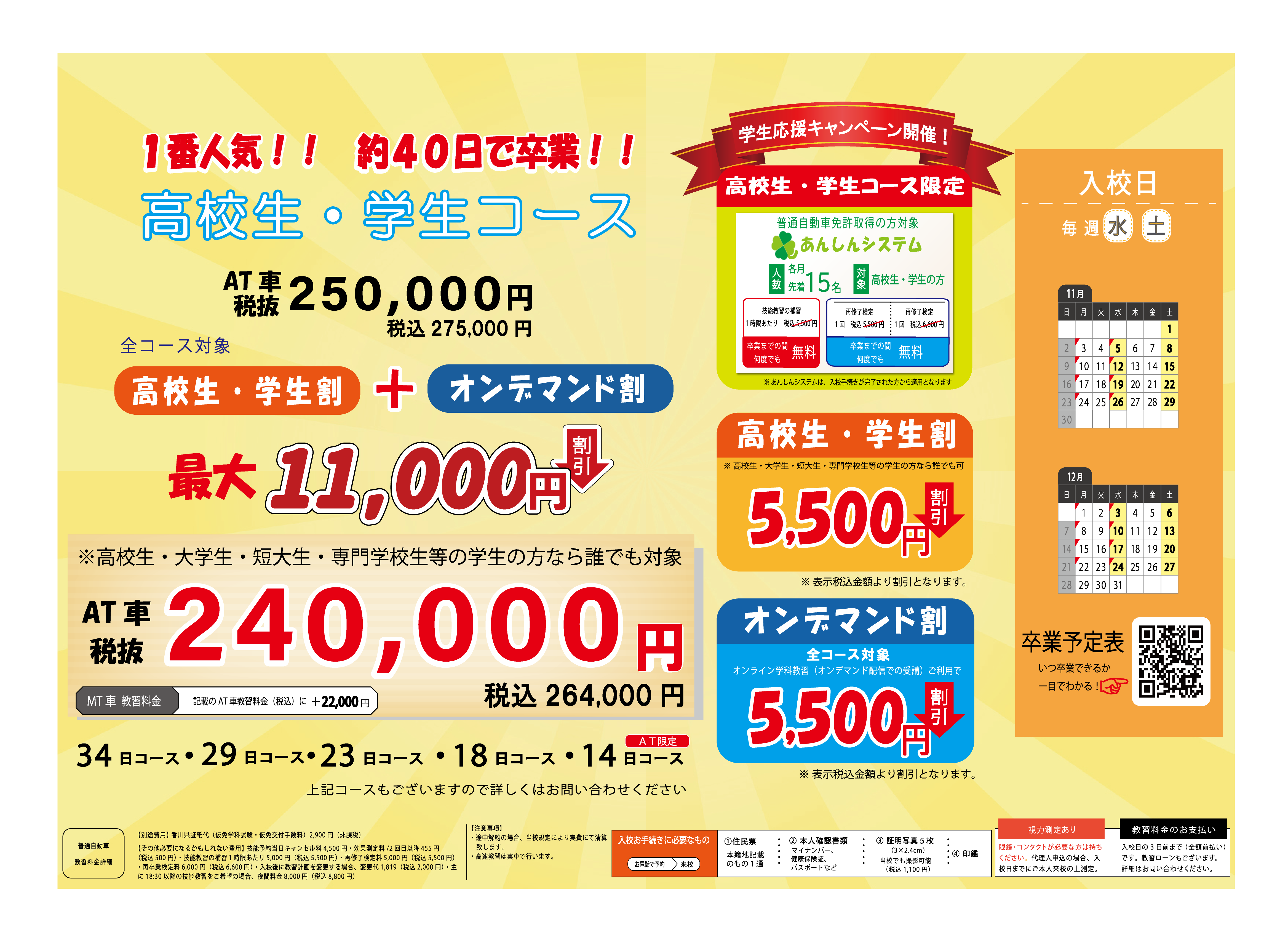 11・12月の普通自動車キャンペーンは、高校生・学生割(学生の方なら誰でも可)とオンデマンド割で教習料金がさらに最大11,000円割引!!