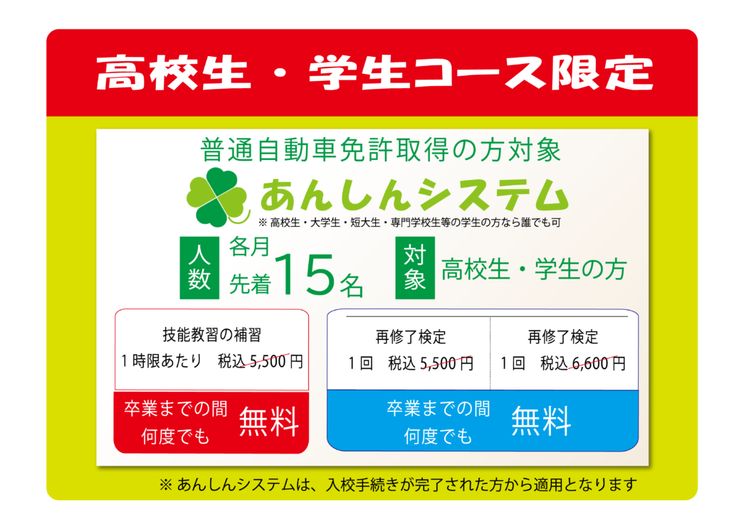 高校生・学生コース限定!!11月12月入校で各月先着15名様に技能補習料金・技能再検定料金が何度でも無料になるあんしんシステムがついてきます!!