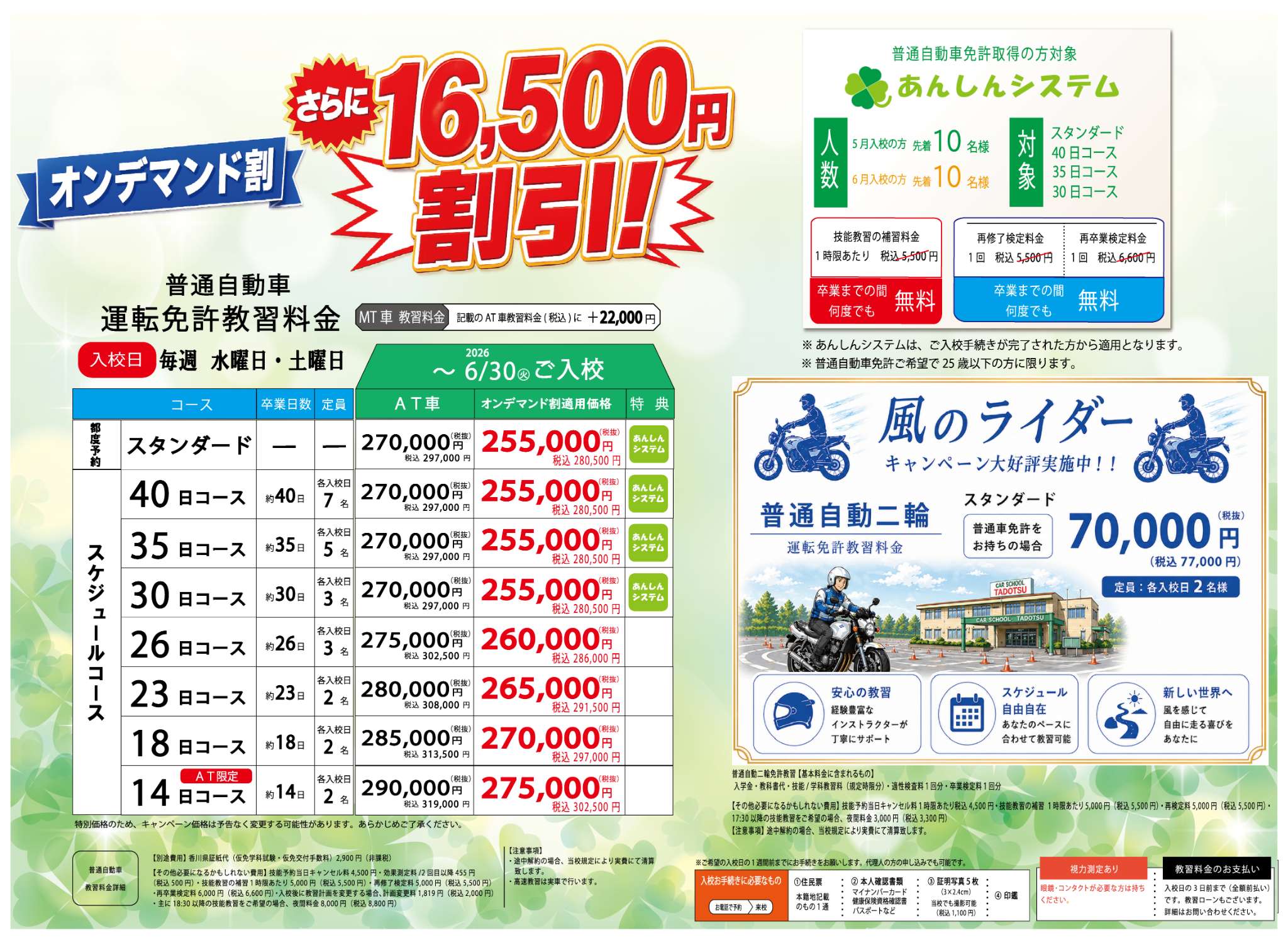 5月・6月のキャンペーン実施中です。オンデマンド割で教習料金がさらに16,500円割引!!しかも、5月・6月入校限定で普通車スタンダード・40日コース・35日コース・30日コースをお選びいただいた方に先着で技能補習料金・技能再検定料金が何度でも無料になるあんしんシステムがついてきます!!